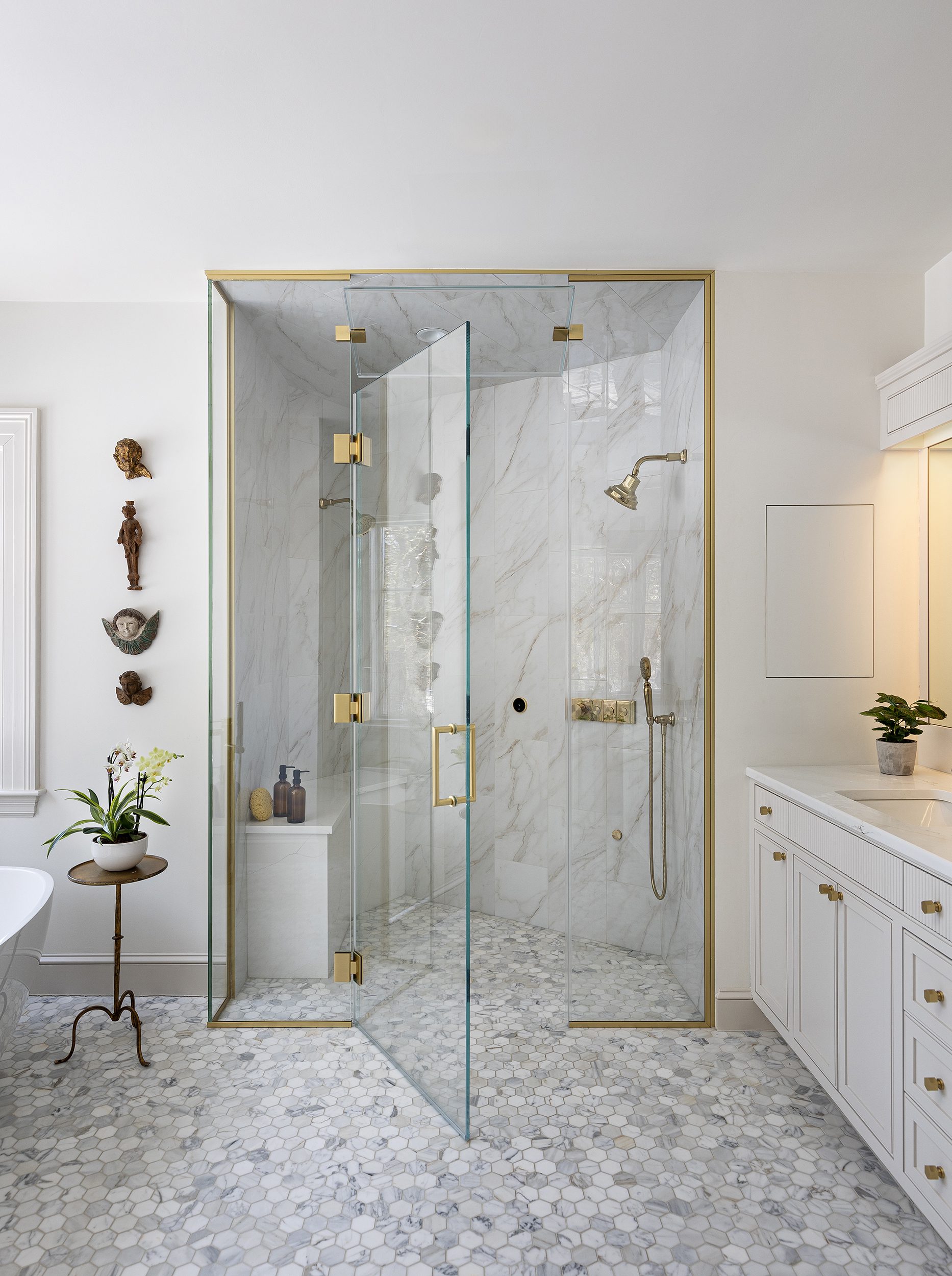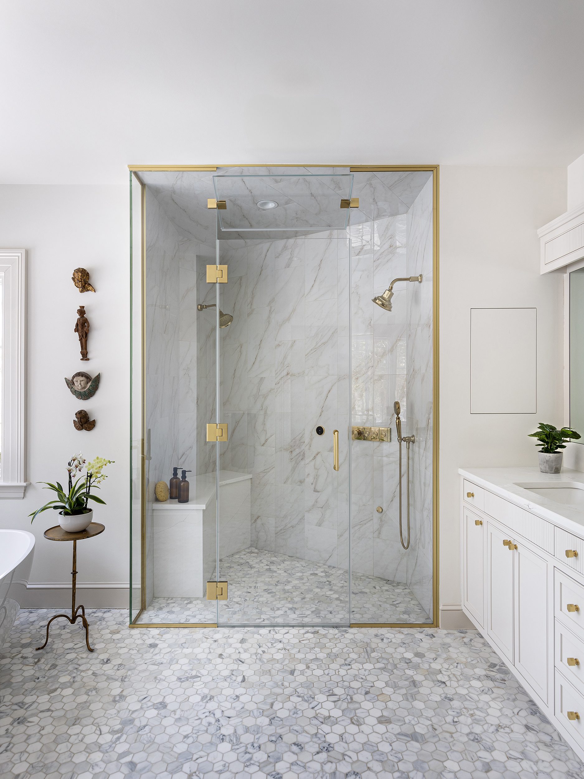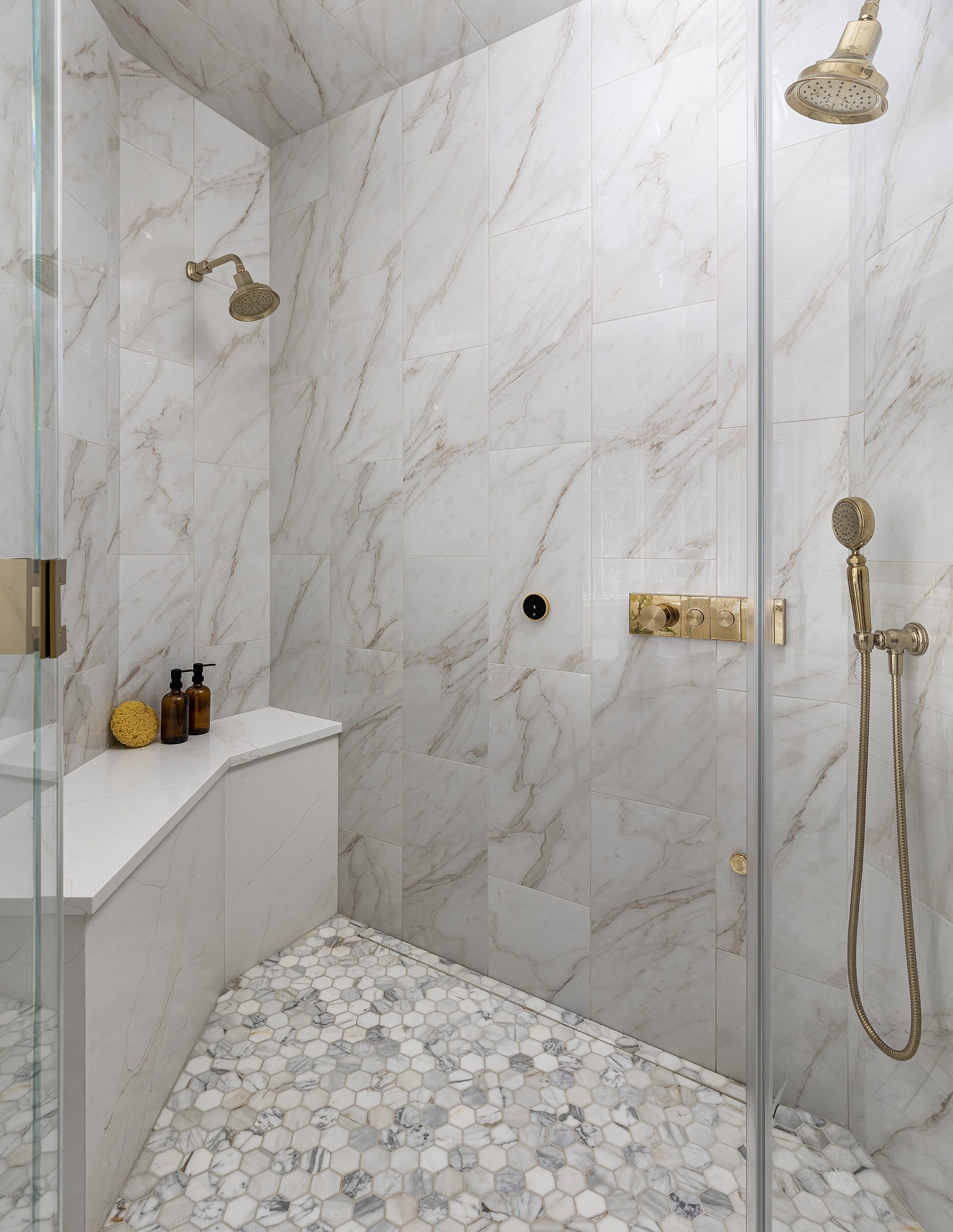 This bathroom remodel upgraded every element while keeping fixtures in place, featuring radiant floor heating that extends five feet up shower walls and onto the custom shower bench. Combined with bespoke millwork and seamless tile work, we transformed the space into a luxury retreat that perfectly matched the client’s vision.